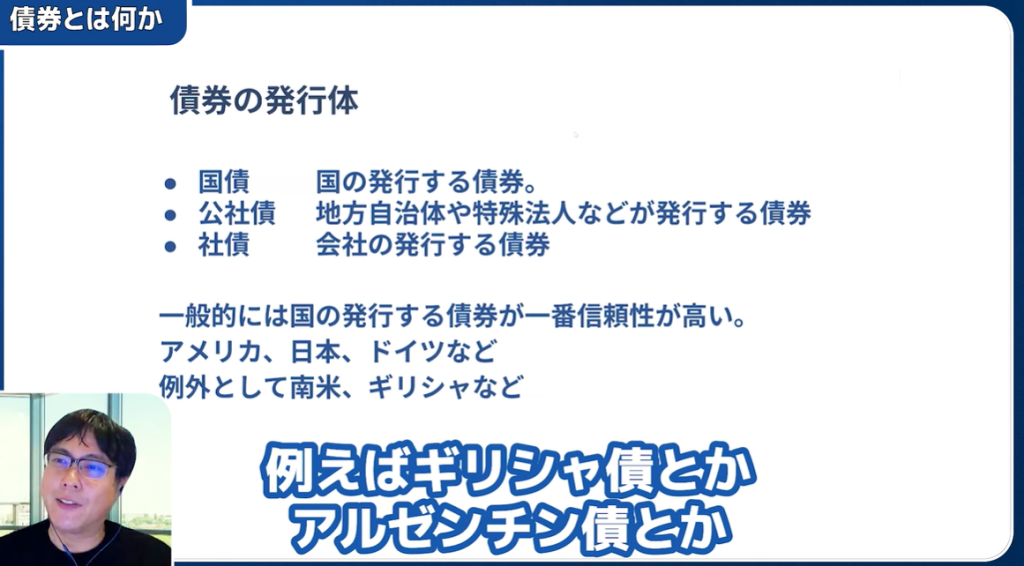 日本国債や米国債など、国が発行する債券です。信用リスクが低く、最も安全性が高いとされます。