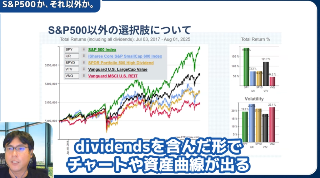 重要なのは「トータルリターン」での比較です。これは配当をすべて再投資した場合の総合的な収益率を意味します。