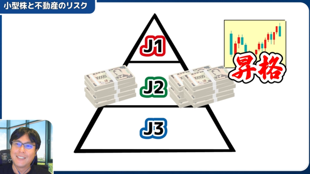 J2でめちゃくちゃ活躍したチームはどうなりますか?J1に昇格しますよね。つまり、小型株投資信託から「卒業」してしまうのです。