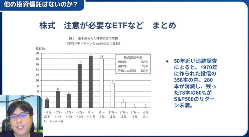 - 仮に生き残っても、半分以上はS&P500に負ける現実